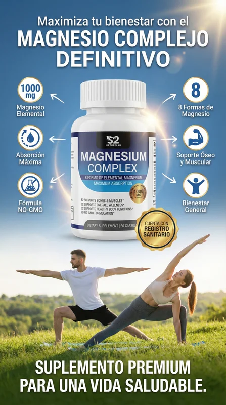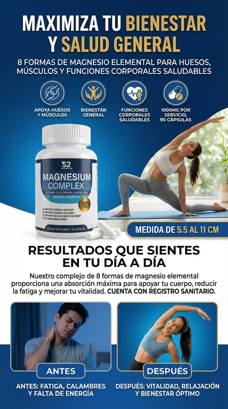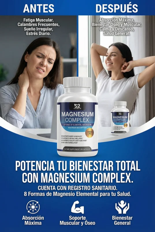 ¿Para qué sirve Magnesium Complex? Este suplemento ayuda a complementar la ingesta de magnesio, un mineral clave para muchas funciones del cuerpo. Según lo que indica su presentación, está orientado a apoyar: Huesos y músculos Bienestar general Funciones saludables del cuerpo Beneficios que puedes comunicar de forma comercial y prudente: Ayuda a mantener una buena función muscular Apoya el bienestar físico general Puede ser un buen aliado en rutinas de cuidado personal Su combinación de varias formas de magnesio ofrece una fórmula más completa Es una opción práctica para quienes desean reforzar su consumo de magnesio diario Cómo explicarlo fácil al cliente: “Es un magnesio más completo, porque no trae una sola forma, sino 8 tipos de magnesio en un mismo producto. Eso lo hace una opción atractiva para personas que quieren apoyar su bienestar general, músculos y huesos con un solo suplemento.” Importante para decir con responsabilidad: Es un suplemento, no un medicamento No está destinado a diagnosticar, tratar, curar ni prevenir enfermedades Si la persona está embarazada, lactando, es menor de edad o tiene una condición médica, debe consultar a un profesional de salud